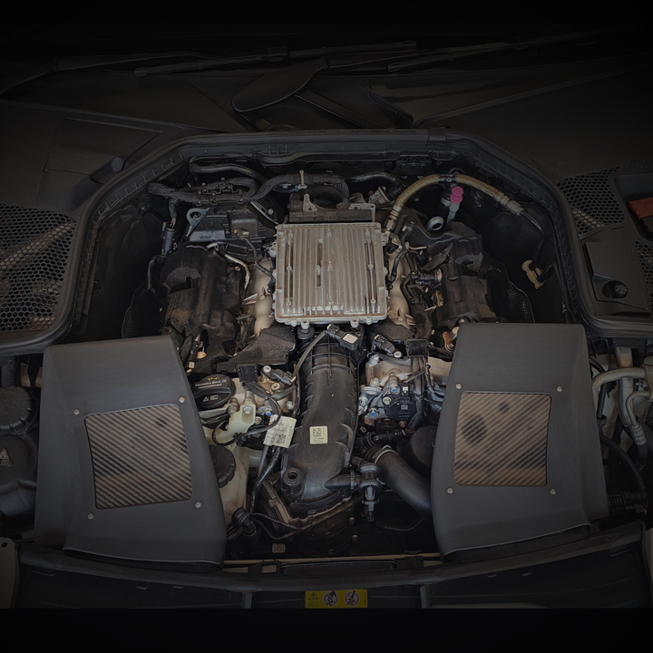 Unser C43/C400-Ansaugsystem ist ein vollständig geschlossenes Kaltluftsystem. Die Ansaugung ist von den externen V-Turboladern weg...